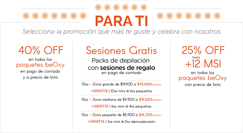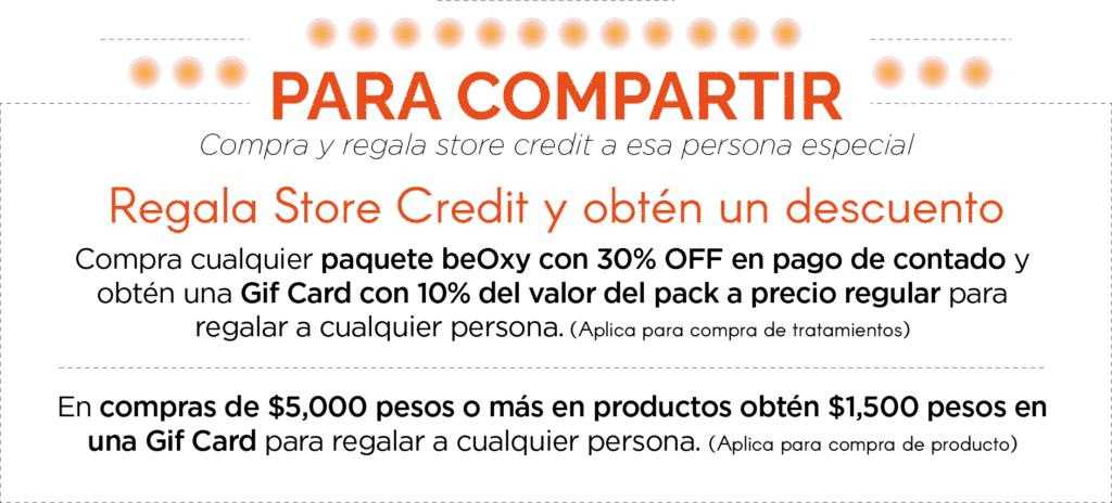- Pago de contado: Obtén un 40% de descuento en todos los paquetes beOxy a precio de lista en pagos de contado con TDC, TDD, efectivo o transferencias.